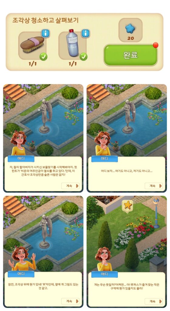 저택 부지 내에 미로도 있다니.. 매디의 저택은 진정 없는 것이 없는…-_-;; 저정도면 거의 놀이동산급 아닙니까?!! 작업은 총 10개로 어려울 것 없이 금방 해결할 수 있는 구역이네요. 구역을 끝내고 나오는 보상은 다른 구역과 똑같아서 뭔가 이득을 크게 본 느낌으로 마무리했습니다. 다음 구역은 머지맨션 미로 구역으로 또 어떤 이야기가 나올지 기대하면서! 보물찾기 구역 포스팅을 마치도록 하겠습니다.